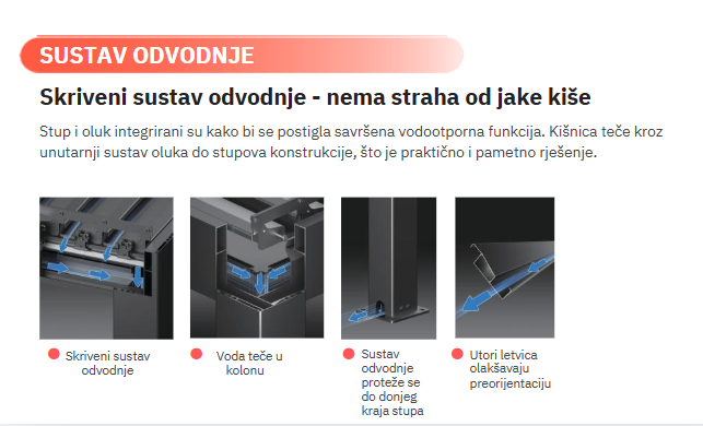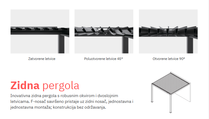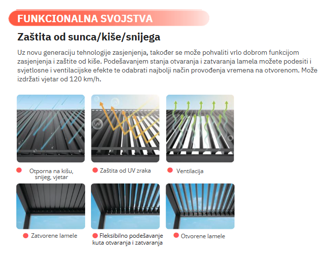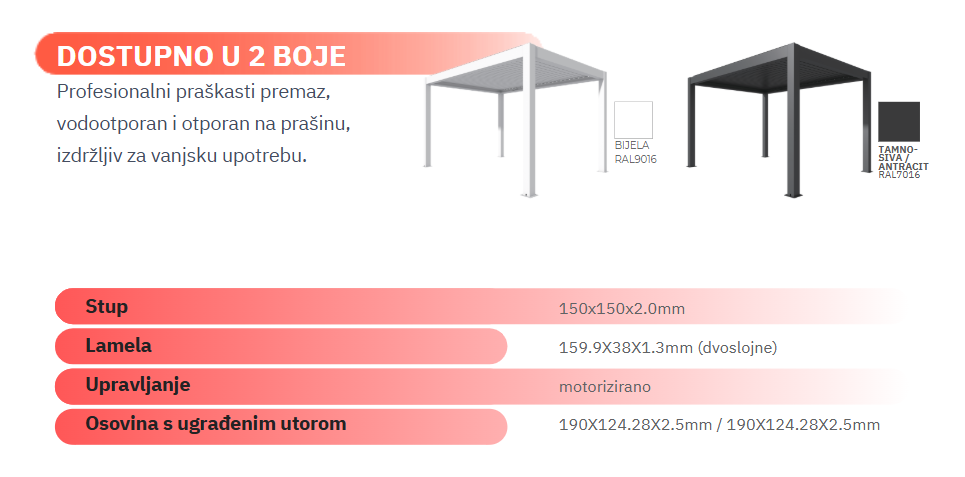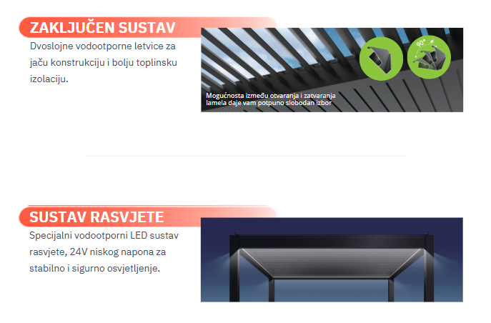 • Pergola po vašem ukusu – birajte između dvije RAL boje i dodataka kao što su LED svjetla, dodatna bočna sjenila i sl.