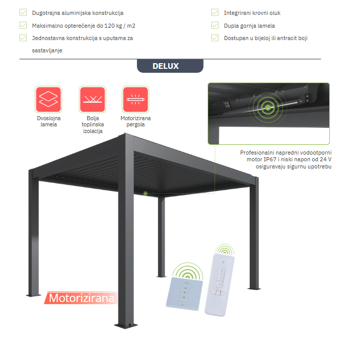Pergola DELUX je nova vrhunska generacija aluminijskih pergola s kvadratnim potpornim stupovima od 150 mm i širim, dvoslojnim letvicama, za otpornost na jak vjetar (do 120 km/h), kišu i snijeg. Visina pergole: 2,5 m, uz doplatu je moguća izrada niže ili više pergole. Nosivost je do 120kg/m2 (SGS certifikat). Dostupna je u dimenzijama: izrada po mjeri. Daljinski upravljač.
